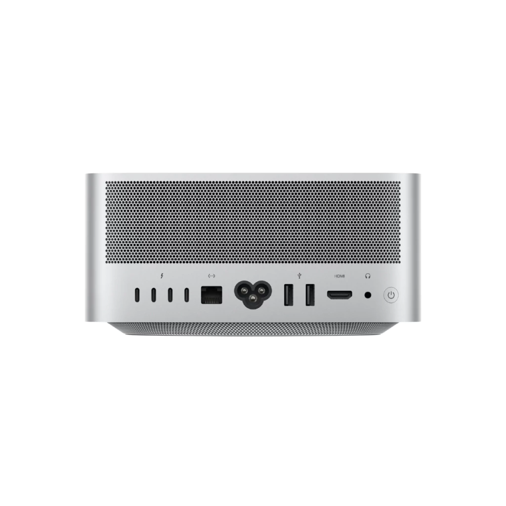 Mesmo com desempenho extremo, o Mac Studio mantém um formato compacto e elegante, com aproximadamente 9,5 cm de altura, cabendo facilmente sob a maioria dos monitores. O sistema de resfriamento foi projetado para manter o desempenho estável sem ruído excessivo.