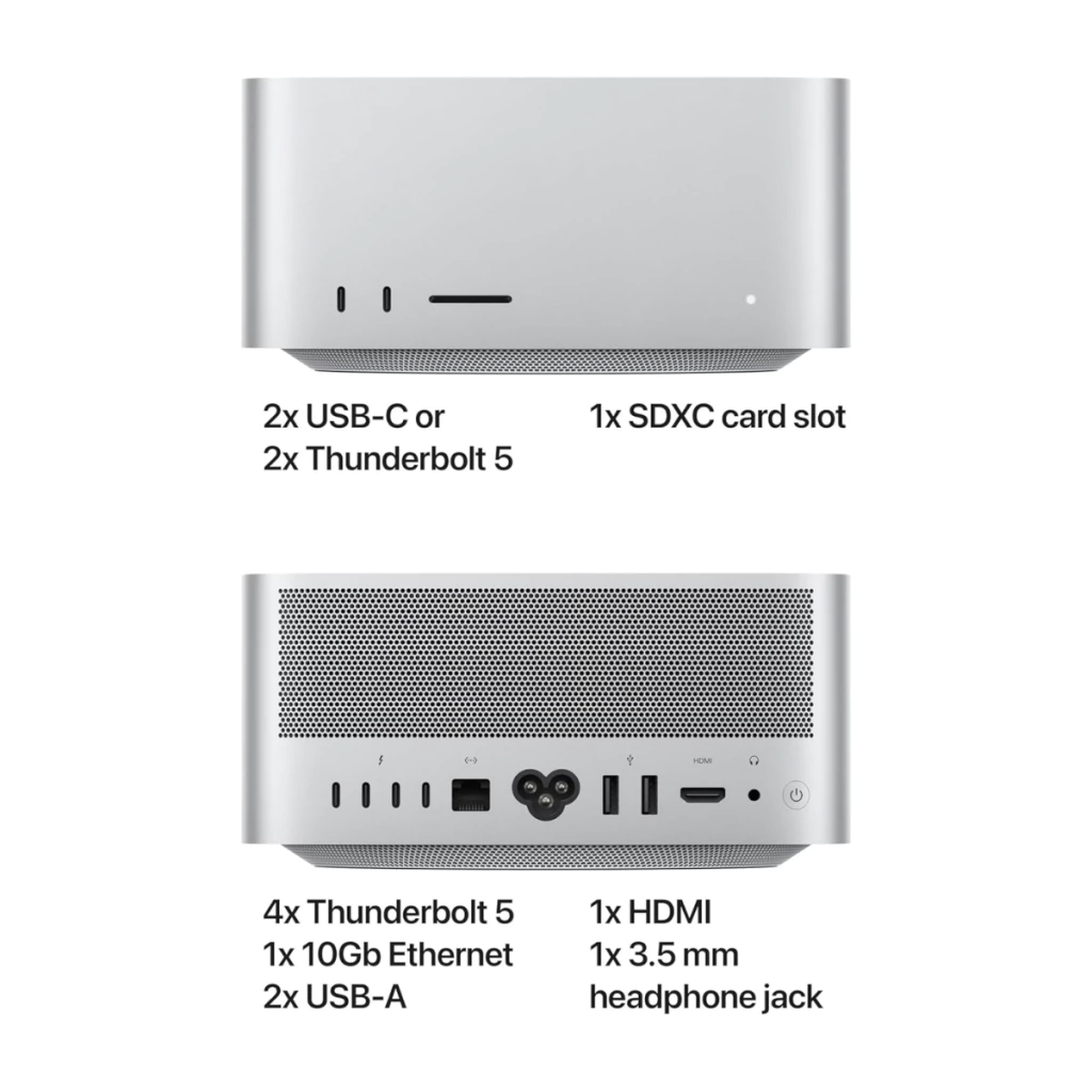 Mesmo com desempenho extremo, o Mac Studio mantém um formato compacto e elegante, com aproximadamente 9,5 cm de altura, cabendo facilmente sob a maioria dos monitores. O sistema de resfriamento foi projetado para manter o desempenho estável sem ruído excessivo.